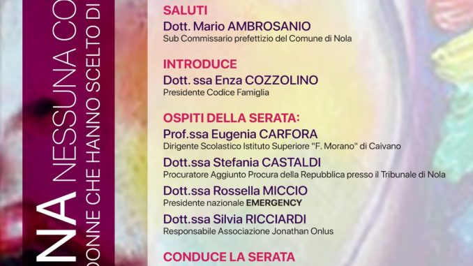 Saranno gradite ospiti della serata la Dott.ssa Eugenia Carfora, Dirigente Scolastico Istituto Superiore “F. Morano” di Caivano nota per il suo impegno che dal perimetro didattico affronta anche delicate istanze sociali,la dott. Ssa Stefania Castaldi, procuratore aggiunto del Tribunale di Nola, la Dott.ssa Rossella Miccio, Presidente nazionale di Emergency e la Dott.ssa Silvia Ricciardi, Presidente Associazione Jonathan Onlus.