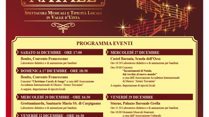 Il Natale si accende di magia e si colora di sapori con l’evento “Concerto di Natale” di Grottaminarda (AV), che sarà presentato giovedì 14 dicembre, alle ore 10,30, presso il Circolo della Stampa di Avellino. La kermesse, voluta dall’Amministrazione Comunale di Grottaminarda e co-finanziata dalla Regione Campania nell’ambito del POC Campania 2014-2020 Linea Strategica 2.4 “Rigenerazione urbana, politiche per il turismo e cultura”, interesserà anche i comuni di Bonito, Castel Baronia e Sturno, partner dell’iniziativa. L’evento, organizzato per venti edizioni dalla Corale Polifonica di Santa Maria Maggiore, grazie al supporto del Comune di Grottaminarda, amplia la sua portata articolandosi in più iniziative che toccheranno diversi luoghi storico-artistici della cittadina irpina e degli altri comuni coinvolti. Nasce così un programma coinvolgente, composto da sei appuntamenti e caratterizzato da un format innovativo che vede, abbinato ad ogni singolo spettacolo musicale, una produzione tipica d’eccellenza della Valle dell’Ufita, area geografica dell’Irpina dove sono collocati i comuni aderenti al progetto. Al termine o in contemporanea a tutti i concerti sarà possibile partecipare, infatti, ad una degustazione di tipicità locali, quali: torrone, dolci natalizi, olio di ravece, formaggi, salumi e piatti della tradizione. Inoltre, il format prevede la realizzazione di sei laboratori ludico-didattici tesi ad affrontare e approfondire la conoscenza dei vari temi che costituiscono la natura stessa del progetto: la musica, il cibo e il Natale. Tutto questo sarà presentato giovedì 14 dicembre presso il Circolo della Stampa di Avellino. Per l’occasione interverranno: Angelo Cobino, Sindaco del Comune di Grottaminarda; Virginia Pascucci, Assessora del Comune di Grottaminarda; Giuseppe De Pasquale, Sindaco del Comune di Bonito; Felice Martone, Sindaco del Comune di Castel Baronia e Vito Di Leo, Sindaco del Comune di Sturno. A moderare l’incontro sarà Annibale Discepolo, giornalista de Il Mattino di Avellino.