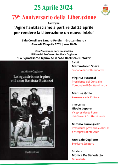 In occasione del 79° Anniversario della Liberazione l’Amministrazione comunale di Grottaminarda organizza il convegno: “Agire l’antifascismo a partire dal 25 aprile per rendere la Liberazione un nuovo inizio” con la presentazione del libro del Professor Annibale Cogliano: “Lo Squadrismo Irpino e il caso Battista-Buttazzi”.