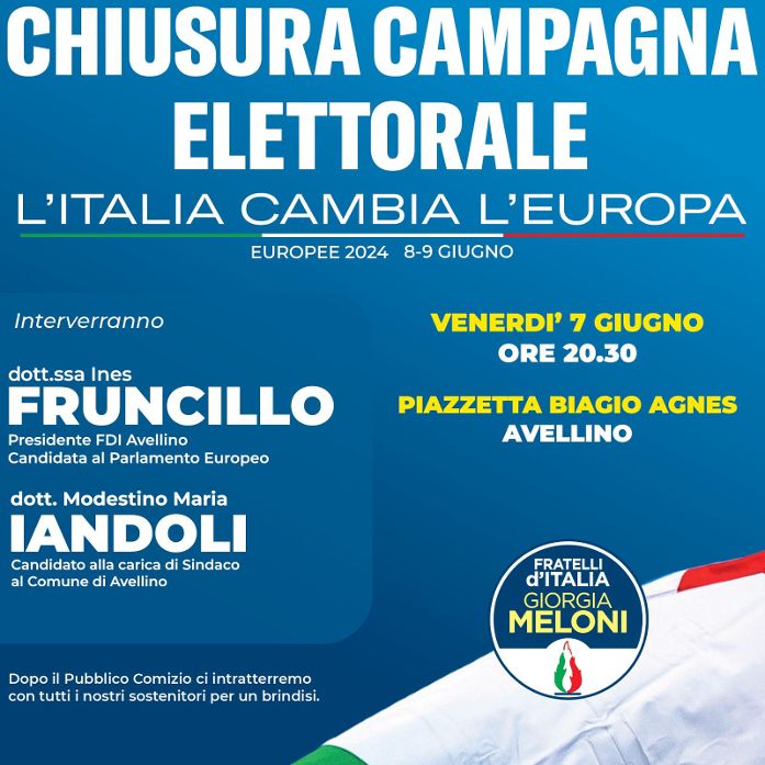 Con queste parole Modestino Iandoli, candidato a sindaco di Fratelli d’Italia per Avellino, presenta l’appuntamento di chiusura della campagna elettorale, con tutto il coordinamento di FDI cittadino, con l’atteso intervento anche da parte della Presidente Ines Fruncillo, candidata alle europee.