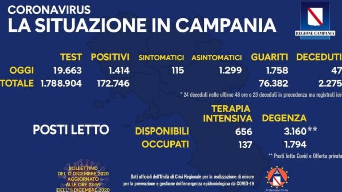 Coronavirus. 1.414 positivi in Campania su 19.663 tamponi.