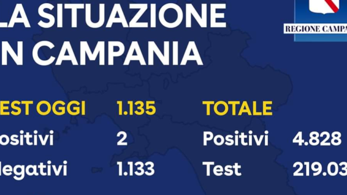L’Unità di Crisi della Regione Campania comunica che nella giornata odierna sono stati esaminati complessivamente 1.135 tamponi di cui 2 risultati positivi.
