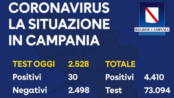 Coronavirus. 30 positivi in Campania su 2.528 tamponi.