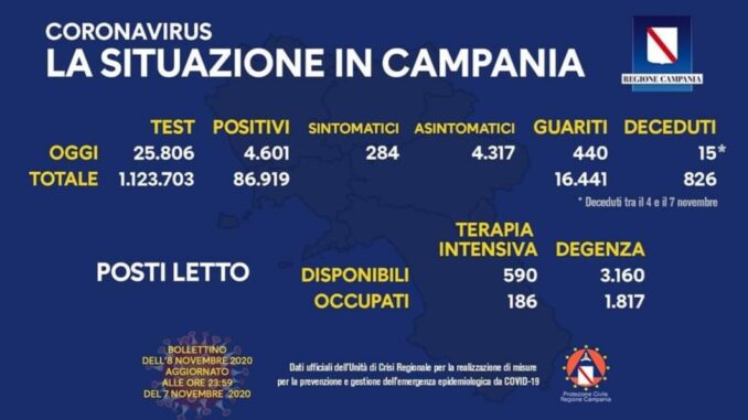 Coronavirus. 4.601 positivi in Campania su 25.806 tamponi.