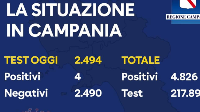 L’Unità di Crisi della Regione Campania comunica che nella giornata odierna sono stati esaminati complessivamente 2.494 tamponi di cui 4 risultati positivi.