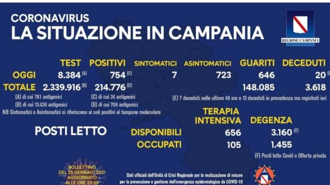 Coronavirus. 754 positivi in Campania su 8.384 tamponi.
