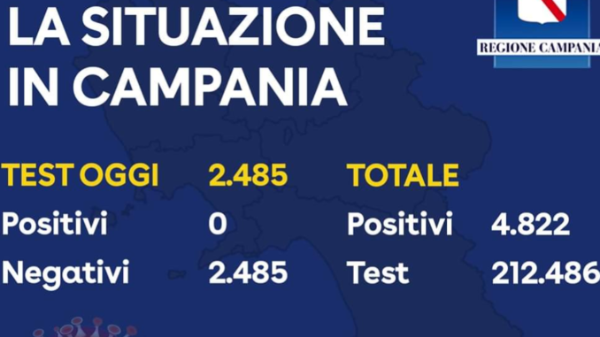 L’Unità di Crisi della Regione Campania comunica che nella giornata odierna sono stati esaminati complessivamente 2.485 tamponi di cui NESSUNO risultato positivo.