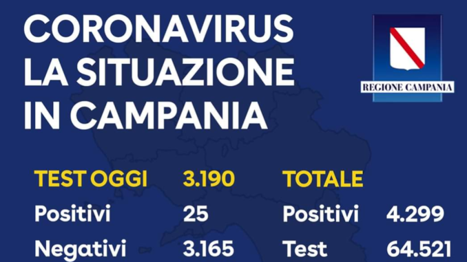 Totale complessivo positivi Campania: 4.299 (al complessivo positivi pari a 4.307 sono stati sottratti gli 8 casi relativi a soggetti asintomatici che, come da comunicazione dell’ospedale Moscati di Avellino, dall’esame di ulteriori due tamponi successivi, sono risultati negativi).