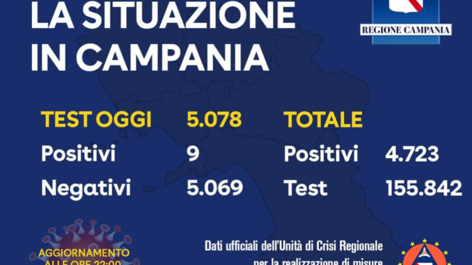 Coronavirus. In Campania 9 positivi su 5.078 tamponi.