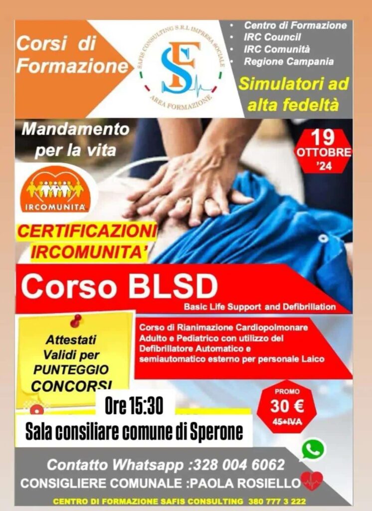 Il 19 ottobre 2024, alle ore 15:30, si terrà presso la sala consiliare del Comune di Sperone un corso di BLSD (Basic Life Support and Defibrillation), organizzato dal centro di formazione SAFIS Consulting S.R.L. Impresa Sociale. Il corso è volto a fornire le competenze necessarie per la rianimazione cardiopolmonare su adulti e bambini, con l’utilizzo del defibrillatore automatico e semiautomatico, rivolto anche a personale laico.