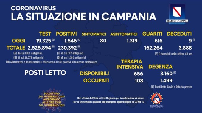 Positivi del giorno: 1.546 (di cui 147 casi identificati da test antigenici rapidi)