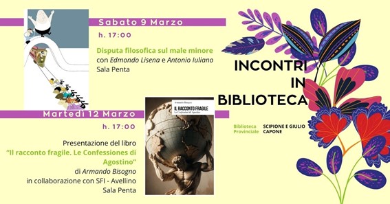 Disputa Filosofica sul Male Minore (Sabato 9 marzo, ore 17.00) Il primo evento, in programma sabato 9 marzo alle ore 17.00 presso la Sala Penta della Biblioteca, sarà una “Disputa Filosofica sul male minore” con Edmondo Lisena e Antonio Iuliano. Entrambi docenti di Storia e Filosofia presso la scuola secondaria di II grado, i relatori affronteranno il dilemma etico noto come “l’uomo grasso” e discuteranno sull’etica del male minore, ispirandosi al libro “Uccideresti l’uomo grasso?” di David Edmonds.