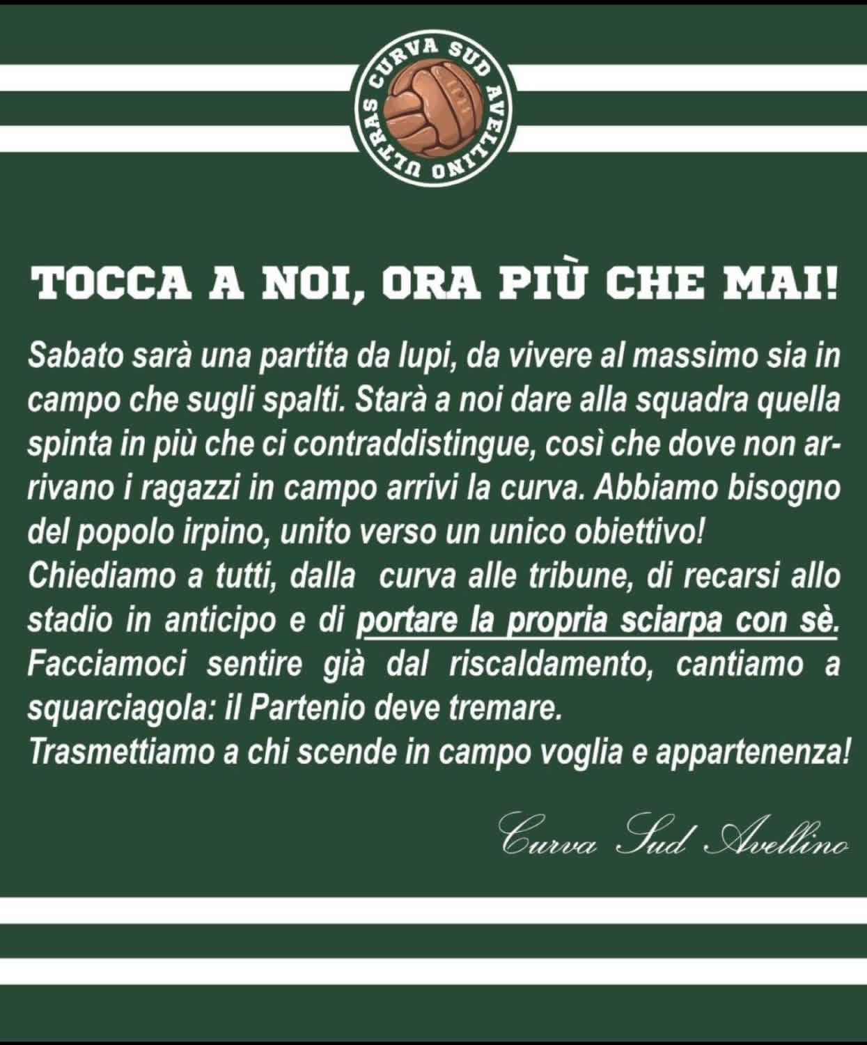 L’obiettivo è uno solo: trasformare il Partenio in un fattore determinante. Per questo viene chiesto a tutti, dalla curva alle tribune, di raggiungere lo stadio con anticipo e di portare con sé la sciarpa, per creare un colpo d’occhio compatto e un’atmosfera carica già dal riscaldamento.