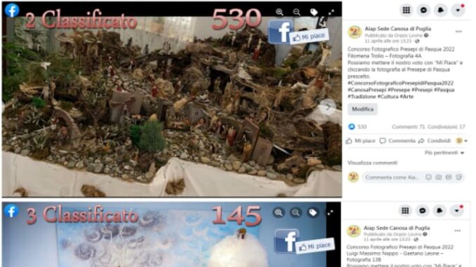Si è concluso domenica 24 aprile il concorso del Diorama Pasquale organizzato dall’associazione Aiap Sede Canosa di Puglia. Ancora una volta il Diorama di Antonino Napolitano esposto nella Chiesa del Piazzale Sant’Elia si è giudicato il titolo di 1 Classificato con ben 716 Mi Piace. l’opera è stata ben apprezzata da tutte le persone che hanno voluto far visita da vicino ma anche da tutti coloro che x problemi vari si sono accontentati di un video o di una foto dai Social. Antonino ringrazia tutte le persone che hanno collaborato x la realizzazione del diorama e tutti le persone che con tatto hanno fatto si che il diorama ancora una volta fosse il più votato.