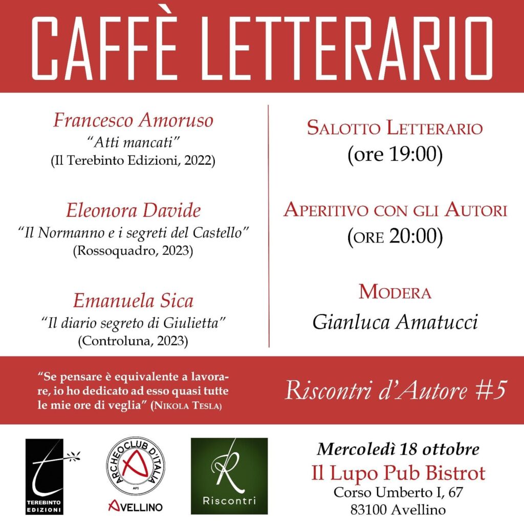 Torna il Caffe Letterario ad Avellino. Appuntamento domani 18 ottobre dalle 19.00 presso il Lupo Pub Bistrot in Corso Umberto I. Protagonisti dell’evento saranno tre autori, come di consueto. Ci parleranno dei loro libri Eleonora Davide “IL NORMANNO E I SEGRETI DEL CASTELLO”, Emanuela Sica “IL DIARIO SEGRETO DI GIULIETTA” e Francesco Amoruso “ATTI MANCATI”.