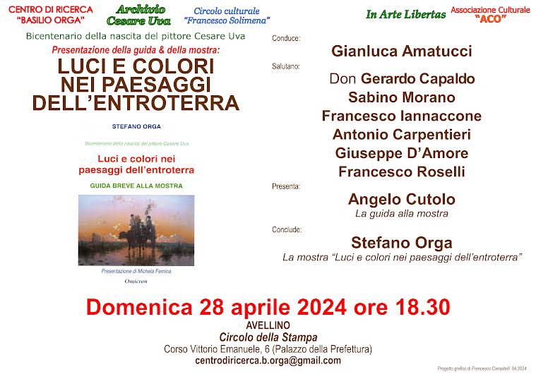 Il Centro di ricerca “Basilio Orga”, l’Archivio Cesare Uva e il Circolo Culturale “Francesco Solimena” organizzeranno la “Presentazione della guida & della mostra <<Luci e colori nei paesaggi dell’entroterra>>” in occasione del bicentenario della nascita del rinomato pittore romantico avellinese Cesare Uva (1824-1886).