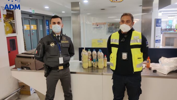In particolare, gli ufficiali addetti ai controlli, non convinti delle spiegazioni ricevute ed insospettiti da ulteriori segnali di “rischio”, hanno controllato i bagagli dei 2 soggetti rinvenendo 569 ovuli contenenti cocaina per un peso complessivo di 8,3 kg, e 3,1 kg di oppio all’interno di alcune bottiglie e confezioni per l’igiene intimo personale, pronti per essere distribuiti nelle “piazze dello spaccio” campane.
