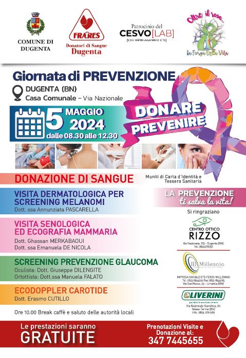 La giornata di domenica 5 maggio invece sarà interamente dedicata, presso la Casa comunale di Dugenta in via Nazionale, alla prevenzione con la possibilità di prenotarsi per la visita dermatologica per screening melanomi con la dottoressa Annunziata Pascarella; per la visita senologica ed ecografia mammaria con i dottori Ghassan Merkabaoui e Emanuela De Nicola; per lo screenning prevenzione glaucoma con i dottori Giuseppe Dilengite e Manuela Falato; e per l’ecodoppler carotide con il dottor Erasmo Cutillo. Nel corso della mattinata sarà inoltre possibile donare il sangue. Tutte le prestazioni sono gratuite e necessitano di prenotazione. Partner della giornata di prevenzione sono, con il Comune di Dugenta ed il CSV Irpinia Sannio ETS, l’associazione “Oltre il rosa…la forza della vita”, il Centro Ottica Rizzo, Impresa sociale III Millenium e Mangimi Liverini Spa.