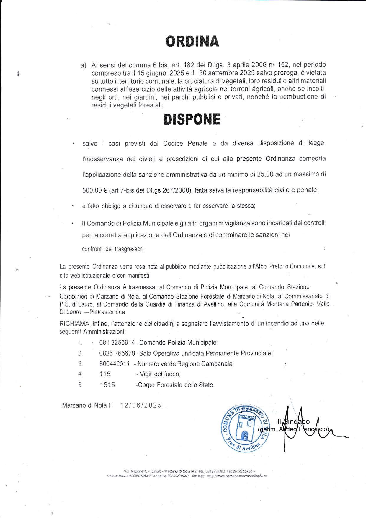 Con l’arrivo della stagione estiva e l’aumento del rischio incendi, il Comune di Marzano di Nola ha emanato l’ordinanza n. 7 del 12 giugno 2025, firmata dal sindaco Francesco Addeo. Il provvedimento recepisce quanto disposto dal Decreto Dirigenziale Regionale n. 334 del 10 giugno 2025, che dichiara lo stato di grave pericolosità per gli incendi boschivi in tutta la Campania nel periodo compreso tra il 15 giugno e il 30 settembre.