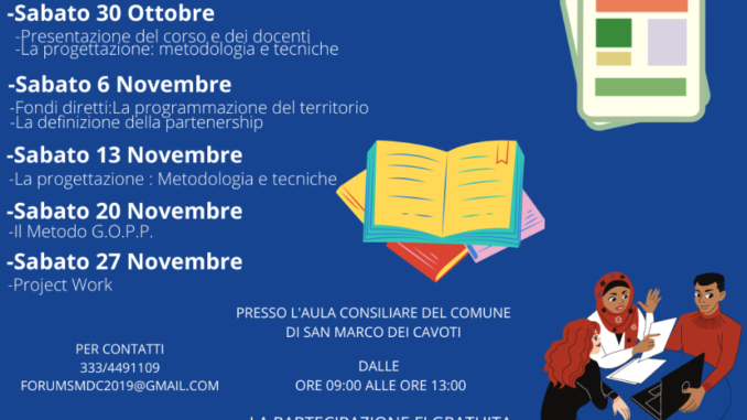 Al via, a partire da questo Sabato 30 Ottobre il corso di progettazione sociale ed europea organizzato dal Forum dei Giovani di San Marco dei Cavoti (BN) per i giovani campani. I 20 corsisti selezionati, giovani tra i 16 e i 34 anni provenienti prevalentemente dalle aree interne del Sannio e dell’Irpinia, avranno la possibilità di formarsi nell’ambito della progettazione sociale e dei fondi europei, acquisendo tutti gli strumenti e le competenze necessarie allo strutturazione e alla stesura di un progetto, grazie ad un programma formativo di assoluta eccellenza erogato dai professionisti della Cooperativa Sociale “L’isola che c’è” di Montoro (AV). Il percorso di formazione si articola in 20 ore di formazione distribuite su 5 giornate. Le attività si svolgeranno dalle ore 9 alle ore 13 tutti i sabati dal 30 Ottobre al 27 Novembre presso l’Aula Consiliare del Municipio di San Marco dei Cavoti. Al termine delle 20 ore di formazione, le quali prevedono anche una fase pratica di project work, verrà rilasciato un attestato di partecipazione ai frequentatori. La partecipazione è completamente gratuita in quanto le attività sono state finanziate grazie all’approvazione del progetto presentato dal Forum di San Marco dei Cavoti nell’ambito del Bando regionale “Giovani in Comune 2.0”. “Siamo entusiasti di questa iniziativa, e aver registrato una così ampia partecipazione al nostro corso, da parte di tanti giovani provenienti da ogni dove della nostre regione, ci rende orgogliosi del nostro lavoro. Siamo fermamente convinti che la formazione rappresenti il punto di partenza per la costruzione del futuro, il nostro futuro. Tra le nostre volontà c’è stata sempre quella di dare qualcosa in più alla comunità e al territorio, dare un segnale forte e far capire che i giovani ci sono e hanno a cuore il proprio futuro. L’obiettivo di questo corso è proprio quello di fornire gli strumenti necessari per poter, attraverso l’intercettazione dei fondi europei e nazionali oggi a disposizione, dare il proprio contributo alla crescita del territorio in cui si è scelto di rimanere, tenendo ben presente la propria idea di futuro verso la quale ogni giovane deve essere obbligatoriamente proiettato. In un momento storico come quello che stiamo vivendo, segnato da un quadro socio-economico in rapidissima evoluzione, le competenze e la professionalità rappresentano l’unico vero “passepartout” per l’accesso al mondo del lavoro. I giovani ci sono e sono pronti ad affrontare le sfide che li attendono. Altro che bamboccioni!”