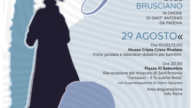 Finalmente, dopo due anni di sospensione, segnati da restrizioni, sacrifici e sofferenze date dalla crisi pandemica, la secolare Festa dei Gigli di Brusciano riprende il suo percorso. Oltre alla ballata del Giglio per la Pace, la settimana dedicata alla Festa dei Giganti, vedrà la realizzazione di uno spettacolo dedicato alla rievocazione del Miracolo di Sant’Antonio, il portentoso evento che da 147 anni viene celebrato dagli abitanti della cittadina vesuviana, che proprio in onore del Santo Munacone, decisero di erigere le tipiche macchine da festa, ancora oggi espressione di Fede dei Bruscianesi. Lunedì 29 agosto, presso Piazza XI Settembre, sarà messa in scena la rappresentazione teatrale dal titolo “Cortaucci – E fu subito festa”, con la partecipazione straordinaria di Gianni Savarese, che rievocherà, per l’appunto, il miracolo cui è associata la nascita della Festa dei Gigli. Si narra che nell’antico borgo di Cortaucci, in quella che oggi è via Cavalcanti, abitasse la popolana Francesca De Falco detta Zi Cecca, molto devota a Sant’Antonio. Ella aveva promesso al Santo una testiera d’oro per il Bambinello che il Santo reca nel palmo della mano destra, purché guarisse suo figlio malato. La donna però, dinanzi alla grazia ricevuta, non aveva potuto tenere fede alla promessa fatta a causa delle ristrettezze economiche. Zi Cecca, mortificata, il 13 giugno del 1875 durante la processione in onore di Sant’Antonio, si affacciò alla finestra e al passaggio del santo nel cortile, lanciò in segno di devozione e gratitudine una “guantiera”, vassoio di petali di fiori e 16 ostie. Tredici di queste si disposero a corona sul capo del Bambinello, restando immobili e sospese: era il segno che il Santo aveva gradito il dono umile e generoso della donna e la sua fede e i presenti gridarono al prodigio. Da quel giorno gli obelischi danzanti sono divenuti un atto di devozione e gratitudine verso il Santo, che svetta sulla cima dei giganti di legno portati a spalla lungo le vie cittadine, nell’ultima domenica di agosto. La rievocazione teatrale sarà abbinata ad un’area degustazione con assaggi di tipicità locali e a viste guidate con laboratori didattici per bambini che si terranno, la mattina del 29 agosto, presso il Museo-Cripta del Cristo Rivelato. La partecipazione è gratuita fino ad esaurimento dei posti disponibili. L’iniziativa è inserita nell’ambito del progetto “La Damigella del Re – Itinerari nella storia”, ed è co-finanziata dal POC Campania 2014-2020 – Rigenerazione Urbana, politiche per il turismo e la cultura. Programma unitario di percorsi turistici di tipo culturale, naturalistico ed enogastronomico di portata nazionale e internazionale.