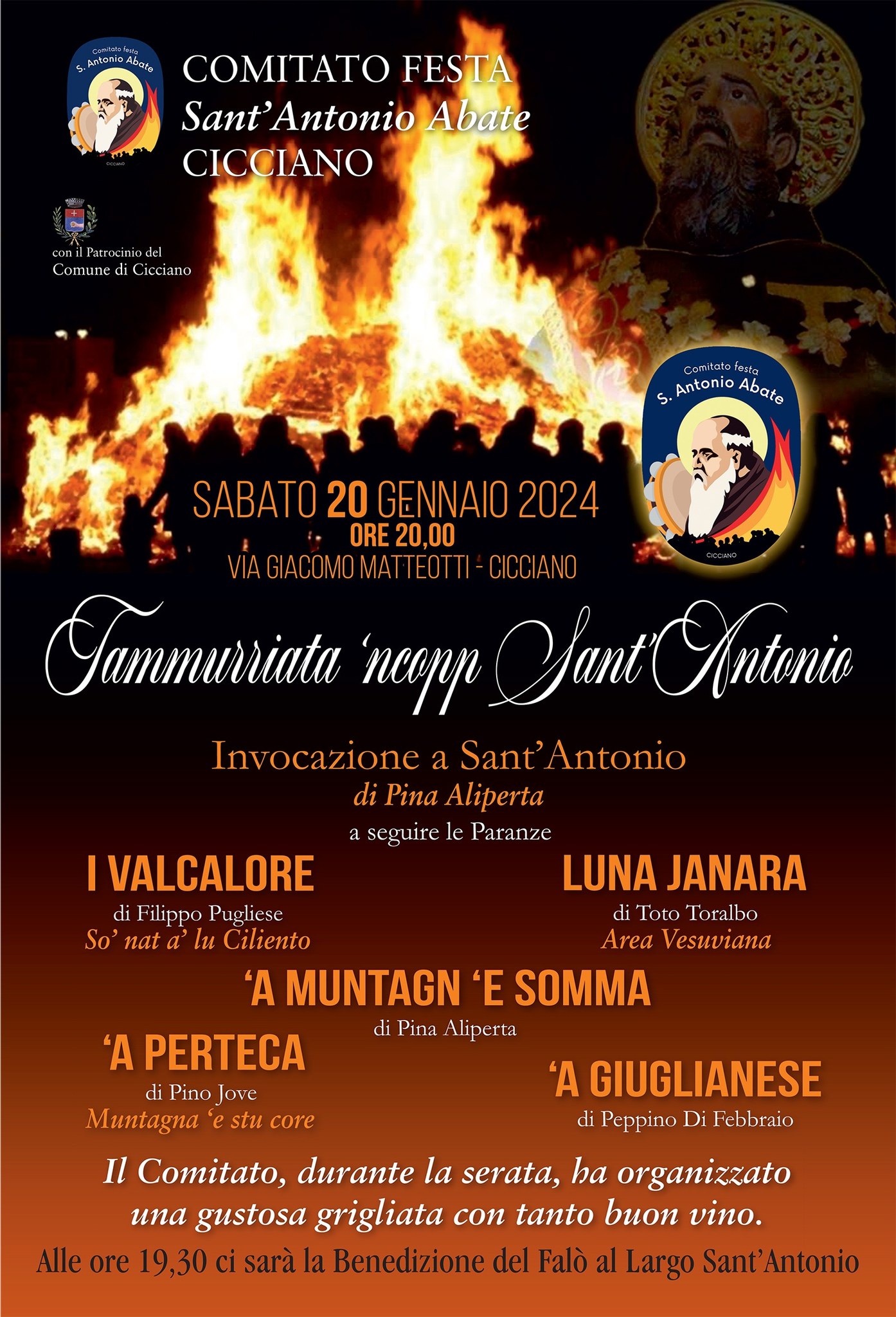 Alle ore 19:30, un momento altrettanto emozionante prenderà vita con la benedizione del falò presso Largo Sant’Antonio. Questo antico rituale sarà seguito dalle esibizioni di gruppi locali come I Valcalore di Filippo Pugliese con “So’ nat a’ lu Ciliento”, e Luna Janara di Toto Toralbo con “Area Vesuviana”. La tradizione sarà celebrata attraverso le esibizioni di gruppi come ‘A Perteca in Muntagna ‘e stu core e ‘A Giuglianese di Peppino di Febbraio.