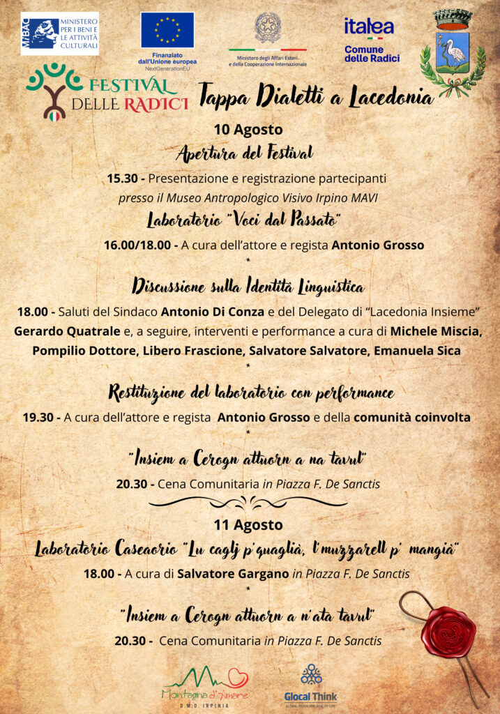 Il 10 e 11 agosto, Lacedonia ospiterà il Festival delle Radici, una due giorni dedicata alla celebrazione dell’identità culturale, linguistica, ancestrale e gastronomica della comunità. Il festival rappresenta un’occasi one per unire chi è rimasto e chi è partito, con un programma ricco di attività ed eventi. Ospite d’eccezione sarà l’attore e regista Antonio Grosso, che condurrà il laboratorio teatrale “Voci dal Passato”.