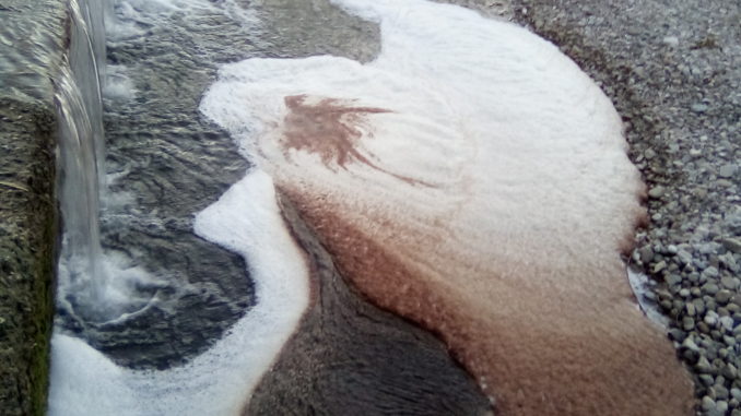 Inoltre, nell’alveo si nota, scarico di liquidi inquinanti di tipo spumoso di colore rosso- scuro, galleggiano sull’acqua, forse provenienti da qualche fabbrica. Come pure si notano, ma in modo minore, allo scarico nel fiume delle acque del depuratore ASI, particelle di colore bianco galleggianti sull’acqua.