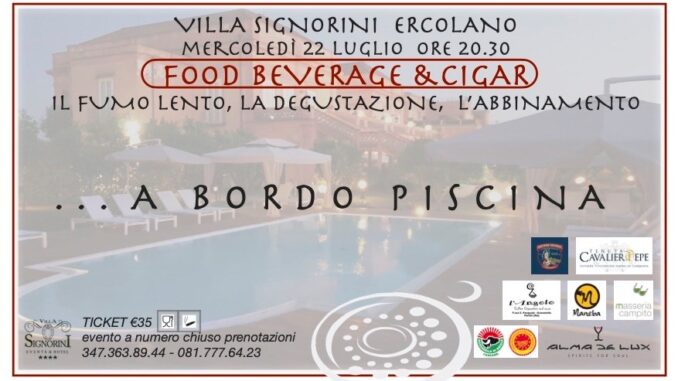 FOODBEVERAGE&CIGAR … A Bordo Piscina  “ Il Fumo Lento, la Degustazione, lAbbinamento”.Mercoledì 22 luglio alle ore 20,30, a Villa Signorini splendida villa vesuviana a Ercolano (NA), a pochi passi dagli Scavi Archeologici di Ercolano, tra il Vesuvio e il Golfo di Napoli, nell’area denominata “Miglio d’Oro”, che nelle forme e nella decorazione esterna ricorda le architetture di Domenico Antonio Vaccaro, ritornano gli eleganti appuntamenti di gusto siglati AIS, Associazione Italiana Sommelier.