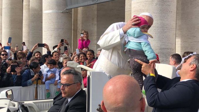 E’ da poco terminata l’udienza comunitaria di Papa Francesco con la comunità di Forino, ed altre provenienti dal resto del mondo, presenti in Piazza San Pietro stamani 29 maggio. Tanta gente, come sempre, giovani, anziani, adulti e bambini che hanno affollato la “Santa Piazza”. I bambini, si proprio loro anime pure, Angeli di Dio presenti anche oggi in gran pletora all’udienza col Pontefice. Tra questi una graziosa, simpatica piccina di nome Angela. Una bimba comune, ma una figlia della Terra di Forino. Il solito giro di Papa Francesco nella piazza prima dell’ udienza , come una forma di benvenuto ai fedeli, come sempre avviene. Ma qualcosa succede. La piccola Angela in una maniera “Santa”, e trasecolare per tutti, è tra le braccia di Papa Francesco. Si “Angela” figlia della terra di Forino, dolce amore di papa’ Ciro e mamma Irene , miracolo di un giorno di festa che scrive il suo nome nella Storia di Forino, e forte significato di” Compiacenza” dell’ Altissimo , segno etereo di benedizione divina per la piccola stessa, ma anche per l’ intero popolo dei Sette Colli, in questo sacro pellegrinaggio romano. Daniele Biondi
