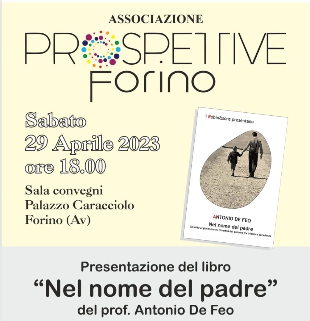 Domani, 29 aprile dalle ore 18.00, nello splendido scenario di Palazzo Caracciolo ci sarà la presentazione del libro Nel nome del padre del professore serinese Antonio De Feo. L’iniziativa è stata promossa dall’associazione culturale Prospettive Forino ed è il primo evento del loro calendario associativo. Un volto ormai noto quello del professore De Feo che, già da qualche mese, sta portando avanti un progetto di filosofia che vede coinvolte tutte le classi quinte dell’IC di Forino. A moderare l’evento rispettivamente la vice presidente dell’associazione Prospettive la professoressa Rosalia Spolverino, già protagonista di molti eventi culturali e il presidente, il dott. Pasquale Iasuozzo. Interverrà anche il sindaco di Forino, il dottor Antonio Olivieri che, sin dall’inizio, ha sostenuto l’iniziativa.