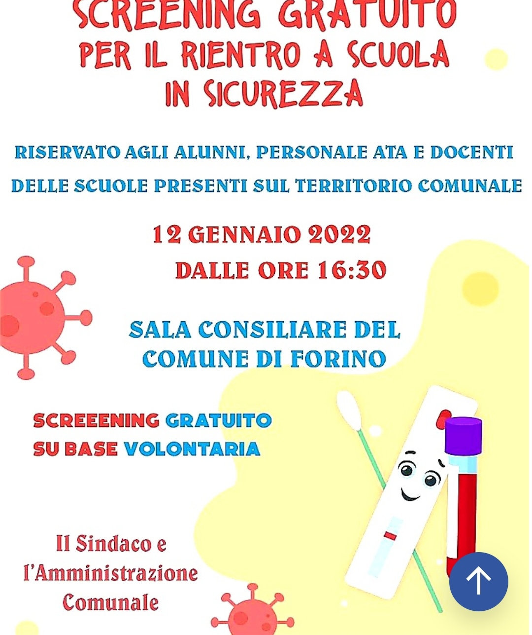 La Scuola riparte in sicurezza dopo la pausa natalizia. Difatti l’Amministrazione Comunale guidata dal Sindaco Olivieri ha deciso di organizzare uno screening collettivo volontario per gli studenti, oltre 550, dell’ I. C. BOTTO PICELLA. Si parte oggi pomeriggio alle ore 16. 30presso la Sede Comunale di Piazza del Municipio, dove alunni, docenti e personale Ata saranno sottoposti, in maniera volontaria ad un rapido test antigenico per essere pronti tutti insieme a riprendere più serenamente questo difficile anno scolastico. Di certo la situazione a livello di persone contagiate non è tra le migliori, infatti un trend in salita ormai da giorni, ha portato il totale a 96 riguardo le persone positive al Covid. Questo screening sarà un ulteriore banco di prova per la cittadina irpina, la quale non certo naviga in acque tranquille. Si deve riprovare a riaprire le Scuole e lo si farà in sicurezza anche grazie all’ Amministrazione Comunale, ma il pensiero che il numero dei contagiati possa ancora aumentare é davvero dietro l’ angolo ed in quel caso l’ unica maniera per il controllo epidemico sarebbero inevitabilmente solo chiusure e restrizioni per la popolazione locale. Staremo a vedere. Daniele Biondi
