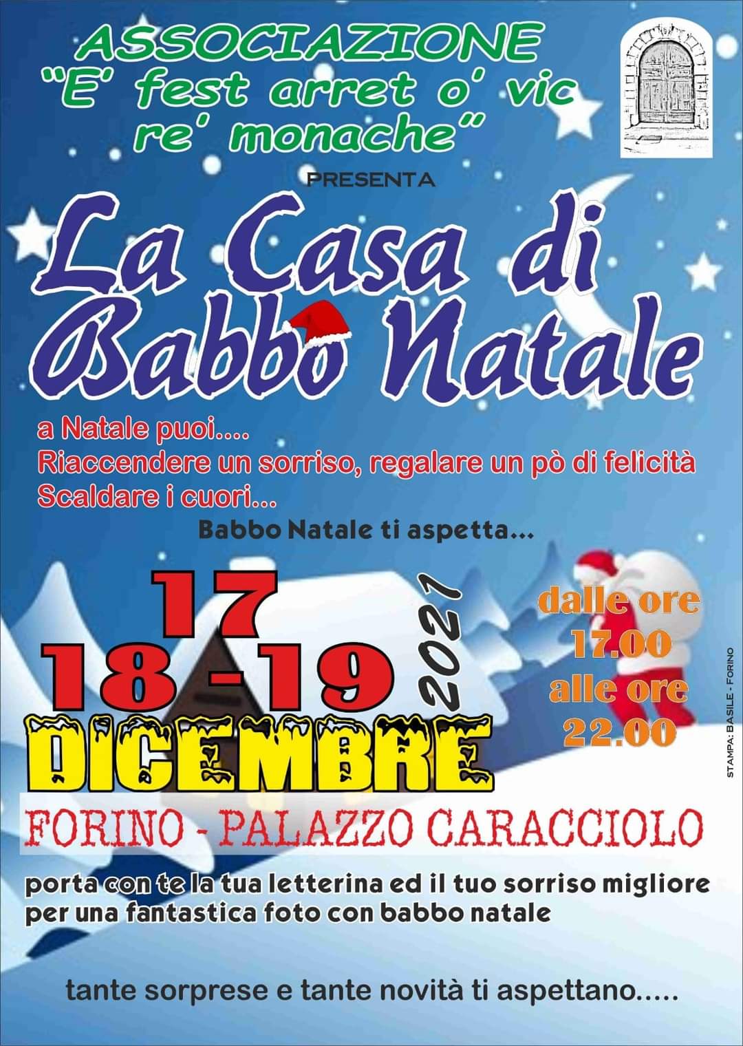Torna la ” Casa di Babbo Natale” a Forino con la Quinta Edizione. Dunque tutto pronto, per un appuntamento con date fissate per il 17-18-19 dalle ore 17.00 alle ore 22.00 Dicembre, in cui sarà possibile visitarla. Iniziativa curata ed organizzata dall’ Associazione Culturale “E’ Fest’ Arret ‘ O’ Vic Re Monache” la quale quest’anno, per la Quinta Edizione, come già accaduto per le precedenti ha fatto ricadere la scelta, sull’antico Palazzo dei Principi Caracciolo in un’atmosfera ed una location da fiaba dove le emozioni , saranno uniche , magiche , indimenticabili. In effetti la Casa di Babbo Natale di Forino, si inserisce in un ampio ed articolato cartellone natalizio di altri eventi. Diversi i giorni , come detto, in cui si potrà visitare la ” Dimora Forinese” del vecchietto venuto dal Polo Nord in cui i bimbi , percorrendo il lungo vialone fatato giungeranno al fatidico incontro con il fantasmagorico Babbo Natale. E “Lui” attenderà i pargoli con tante sorprese, sorrisi e caramelle. E poi la letterina, che ogni bimbo potrà consegnare direttamente tra le mani dal “Vecchietto dal cuore d’oro” il quale sicuramente non disdegnerà di accontentare tutti. Infine novità di quest’anno sono le “palline con foto personalizzate” attraverso le quali si potrà immortalare la magia del Natale in un’unica pallina da appendere al proprio albero di Natale. Daniele Biondi