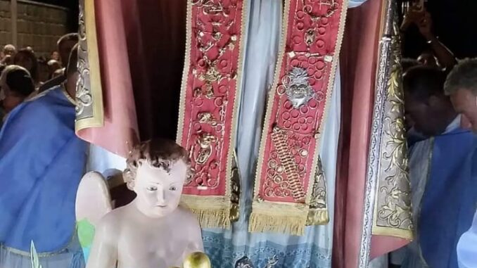 Sono da poco passati i festeggiamenti per la discesa in Città dell’ immagine del Patrono di Forino San Nicola di Bari. Tanta emozione, tanta commozione in una giornata di giovedì 3 Agosto iniziata con la 35 ma Fiaccolata partita da Sant’Agata di Puglia ai falò, ai fuochi pirotecnici, ai Santi incontri nelle frazioni di Celzi con Sant’Anna e Madonna del.Carmelo a Petruro con San Michele e San Felicissimo. Migliaia le persone presenti, tante anche da paesi limitrofi che hanno assistito a questa ” magia di fede e folclore ” . Uno dei più particolari momenti è stato sicuramente quando Padre Marco Masi sacerdote di Forino all’ arrivo dell’ immagine del Santo dinanzi al Cimitero, ha” riconsegnato” allo stesso, dopo quasi venti anni di assenza, la stola con tutti ex voto di oro che da anni è depositata nei forzieri di un istituto bancario della provincia. Un gesto davvero forte visto che in sé per sé, gli stessi ex voto non hanno un valore economico e venale così importante, ma sicuramente un valore speciale per tutti coloro che nel corso di questi secoli , per qualsiasi Grazia Ricevuta, hanno voluto omaggiare il Santo con un gesto particolare. Una sorpresa davvero gradita a tutti i forinesi che dopo anni , e per una serata, hanno visto “rivestito” il Santo Patrono dell’ oro degli avi riposto già il giorno successivo di nuovo nei forzieri bancari. Daniele Biondi