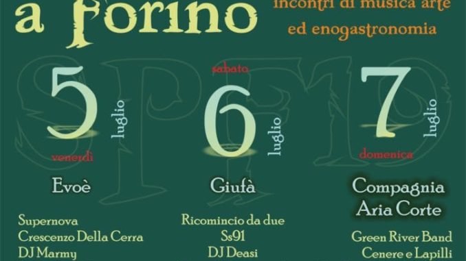 Venerdì 5 luglio dalle ore 21:30 ci saranno: i Supernova, band campana che rivisita, in chiave acustica, brani della musica italiana dagli anni ’60 agli anni ’90; Crescenzo Della Cerra, giovane artista forinese che propone un live show Karaoke nel quale cantare le più belle canzoni italiane e straniere e scatenarsi con balli di gruppo più di moda; Dj Marmy con una selezione musicale che ripercorre le sonorità della Musica Latina dalla tradizione alla modernità; Il Trampoliere che con una innata eleganza e il tocco di colore dei costumi di scena, stupirà tutti i passanti con le sue doti di equilibrismo; Mary Poppins e le bolle di sapone che propone uno spettacolo nel quale, come nella favola di Disney, dalla sua valigia farà uscire con un soffio di passione, enormi bolle di sapone. Chiuderanno la serata nel palco centrale di Largo Ponte gli EVOE’, gruppo di musica popolare nato nel beneventano dove i vari componenti, dopo un’attenta ricerca etnica sul territorio, danno vita ad un progetto musicale che rispetta la tradizione e le sonorità tipiche della propria terra volgendo lo sguardo a nuove sonorità.Sabato 6 luglio dalle ore 21:30 ci saranno: i Ricomincio da due, progetto che unisce musica e teatro in ricordo di due artisti immensi: Pino Daniele e Massimo Troisi, ripercorrendo tutta la loro carriera artistica fin dagli esordi; Gli SS91, formazione musicale proveniente dalla Baronia omaggiano cantautori italiani e stranieri come Mannarino, Jovanotti, Manu Chao, Bandabardò ed altri, oltre ad eseguire brani inediti; i DEEPP Dj-Set che propone un sti ne che parte dal Reggae, generalmente di produzione più recente e seguendo una selezione che prevede scelte dettate dai bpm e da sonorità simili, con ritmi sempre più decisi e incalzanti, arriva ai più spinti groove della dance hall jamaicana; Mr. Fiorentino torna con il suo nuovo spettacolo, un art di che emoziona il pubblico nazionale ed internazionale con performance di fuoco e contact juggling; Maria Russel, proveniente dal cast di Italia’s got talent, lascerà incantati e senza parole adulti e bambini con numeri di illusionismo, apparizioni e magie. Chiuderanno la serata nel palco centrale di Largo Ponte i GIUFÀ, band Siciliana nata nel 2008 che si colloca all’interno della scena musicale World Music europea con un genere che spazia dal Klezmer al Balkan-Beat con una forte matrice rock. Riff di fiati incalzanti, chitarre distorte, cassa in quattro e sonorità balcaniche, sono i quattro ingredienti principali che riescono a trascinare, coinvolgere e far saltare il pubblico di ogni età. A seguire ci sarà DEASI, giovane Deejay-Producer viterbese di grande talento che già all’età di soli 14 anni aveva attirato molta attenzione su di sé da parte di alcuni grandi nomi e profili rispettati nel settore. Il suo dj set è una miscela di pura energia grazie al suo suono inconfondibile.