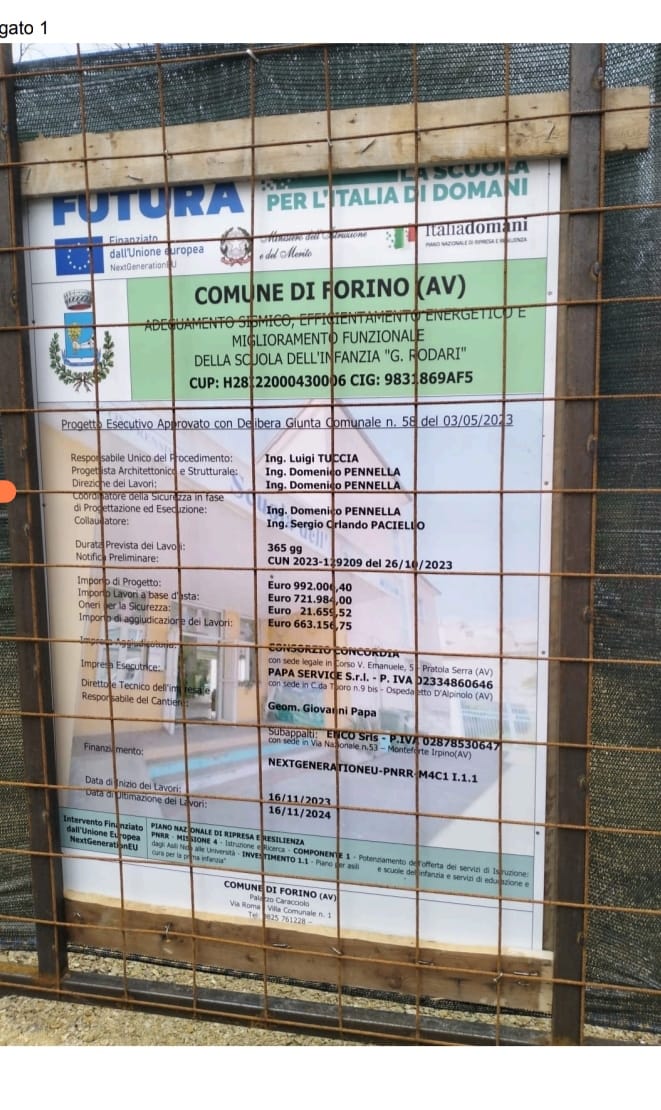 Il cartellone dei lavori davanti alla Rodari parlava chiaro. Diceva che i lavori sarebbero partiti il 16 novembre 2023 e finiti il 16 novembre 2024. Quindi neanche da programma avresti consegnato la scuola ai bambini. Mi sembra una serena e pacata presa per i fondelli. E per di più all’improvviso il cartellone dei lavori è scomparso dalla facciata della Rodari , nascosto, come si nasconde la vergogna. Tanto i forinesi non si accorgono delle finezze e si bevono tutto, vero? No no. Stai tranquillo. I fornirsi non sono fessi (per promemoria ti allego una foto del cartellone dei lavori misteriosamente scomparso, così fai mente locale. Al suo posto una pianta rampicante ha preso il sopravvento, soffocando l’impalcatura del cantiereALLEGATO1).