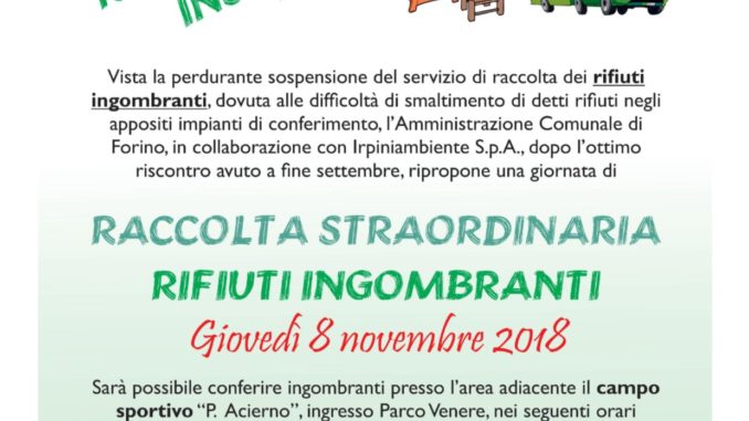 Il Comune di Forino organizza per il giorno giovedì 8 novembre c.a una Raccolta Straordinaria di Rifiuti Ingombranti. Alla stregua del buon risultato ottenuto nel mese di Settembre, l’ amministrazione comunale viene incontro al cittadino che volesse disfarsi di rifiuti che possono essere da ingombro al proprio domicilio. Punto di raccolta, Parco Venere nei pressi del Campo Sportivo “Acierno” con orari 8.30-12.30 di mattina, 15.30-18,30. Si ricorda però che non e’ possibile conferire rifiuti RAEE ( Televisori, Frigoriferi , Lavatrici etc.) per i quali il ritiro e’ a domicilio , prenotandosi al numero 0825/761228. E dunque apprezzabile iniziativa comunale tesa alla salvaguardia dell’ambiente , ed alle esigenze del cittadino, in quella logica che chi tiene all’ ambiente , tiene a se stesso. Dunque l’appuntamento è per giovedì 8 novembre presso il piazzale antistante lo stadio comunale di Forino. DANIELE BIONDI