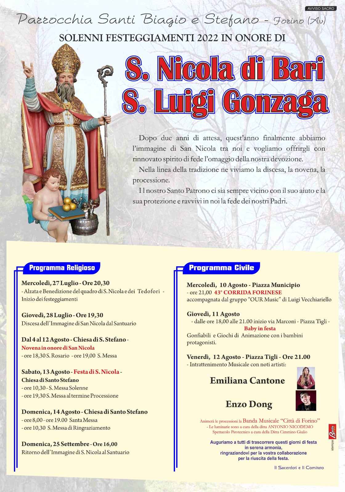 Due Anni lontani da San Nicola .Lui il Santo Patrono ha sempre Protetto Forino dal suo Santuario in Collina, ma la lontananza si è sentita eccome . Domani 28 Luglio dopo due lunghissimi anni di assenza il desiderato ritorno. E solo chi non è figlio della terra di Forino, non sa che i forinesi, da secoli sono legatissimi alla figura del loro Santo Patrono San Nicola di Bari. Un culto antichissimo importato nella Terra dei Sette Colli dai soldati Bizantini negli anni 515- 520 d.C. allorquando quella “Rozza Immagine appesa ad un albero” sulla collina di Castello, cosi asserisce lo storico Vespucci, e’ divenuta idioma di fede, di speranza, di devozione, fino a giungere ancora piu’ forte ai nostri giorni. Ma se l’incidere del tempo a volte cancella la memoria dei tempi, riguardo San Nicola Patrono di Forino, questo non e’ avvenuto, perche’ vuoi le credenze popolari, vuoi i vari ” interventi divini” , San Nicola per i forinesi, e’ stato e sara’ sempre presente nei momenti bui e difficili della gente locale. Tante sono le testimonianze di fede al Patrono, iniziando dai nomi, “Nicola, Nicoletta”, che a Forino abbondano, alle storie di vita raccontate da gente comune, cui parlano di prodigi, di miracoli ricevuti, senza contare l’impronta della storia secolare con tanto di interventi miracolosi , o ritenuti tali, che fanno e faranno del Padre San Nicola, il Santo dei Forinesi così come lo fu nel 1631 quando scampò Forino alla tremenda eruzione del Vesuvio, così come fu nel 1943 quando scampò Forino di essere rasa al suolo da parte dei tedeschi , così come nel 1866 anno in cui scampò la cittadina da una grave epidemia e che portò da quel giovedì di fine luglio , a voto di futura memoria, la tradizionale discesa in paese . La credenza supera però la comune realtà . Infatti si dice che San Nicola Patrono di Forino, non appena venga portato fuori dal Santuario in collina , al primo volgere dello sguardo verso la sottostante valle di Forino, elargisca tre grazie. Su ciò non possiamo esprimerci, ma sul fatto che quest’anno la processione che condurrà il simulacro del Protettore in paese, avrà un ancor maggior accorso di persone confronto ad altri anni, questo lo possiamo chiaramente ribadire. E lui San Nicola , che seguendo quell’antico e secolare percorso che lo condurrà, nella frazioni di Castello , Celzi e Petruro, sarà di nuovo pronto a donar conforto a quanti lo invocheranno per devozione o per pietà. Di seguito manifesto completo dei festeggiamenti. Daniele Biondi