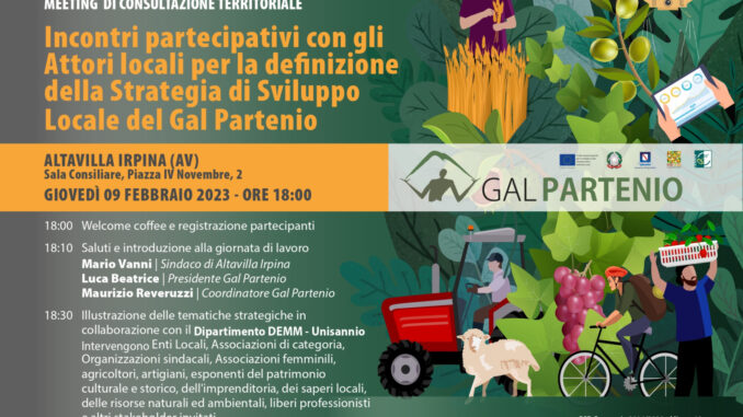 Tappa ad Altavilla Irpina per gli incontri partecipativi con gli attori locali per la definizione della Strategia di Sviluppo Locale del Gal Partenio. Giovedì 9 febbraio alle ore 18 presso l’aula consiliare di Altavilla Irpina si terrà l’incontro di animazione territoriale promosso nell’ambito del PSR Campania 2014/2020 – Misura 19 – Sostegno allo sviluppo locale LEADER – (SLTP – Sviluppo locale di tipo partecipativo) Sottomisura 19.1 – Sostegno preparatorio Tipologia 19.1.1.