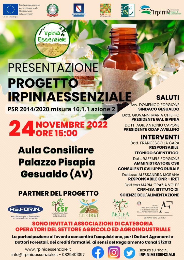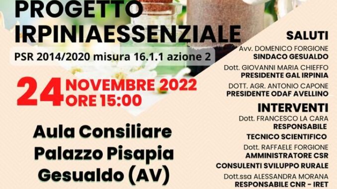 CSR (Consulenti Sviluppo Rurale Ambiente e Territorio Società Professionale) in partenariato con CNR-IRET e CNR-ISA, BIOLEA e AS.FOR.IN. il giorno 24 Novembre ore 15.00 nell’Aula Consiliare del Palazzo Pisapia Gesualdo (AV) presenta il progetto Irpinaessenziale, tracciandone gli obiettivi e i risultati preliminari ottenuti dagli istituti di ricerca del CNR.