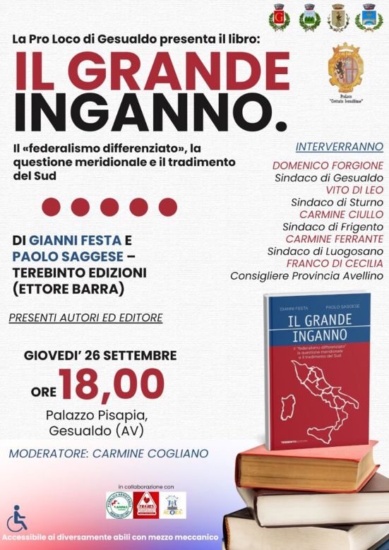 Al centro del dibattito vi sarà la presentazione del libro “Il Grande inganno. Il «federalismo differenziato», la questione meridionale e il tradimento del Sud” di Paolo Saggese e Gianni Festa, edito da Terebinto, che analizza gli impatti della riforma sui delicati equilibri tra Nord e Sud.