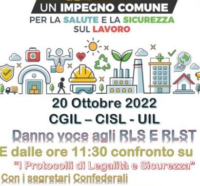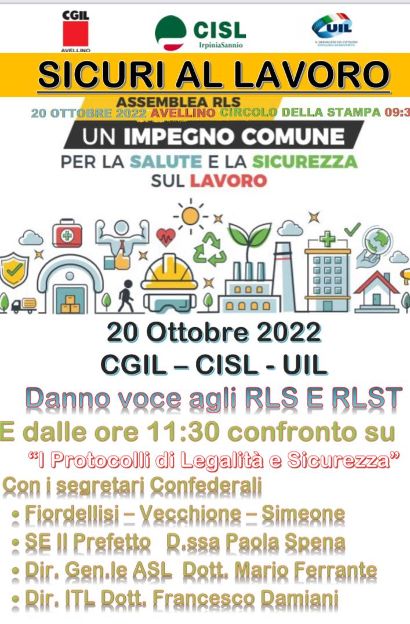 – Domani, 20 ottobre 2022, al Circolo della Stampa di Avellino, i segretari confederali irpini, Franco Fiordellisi (Cgil), Fernando Vecchione (Cisl) e Luigi Simeone (Uil) svolgeranno l’assemblea dei delegati RLS ed RLST della provincia sui temi della salute, sicurezza e prevenzione nei luoghi di lavoro. A seguire, dalle ore 11:30, incontrano il prefetto di Avellino Paola Spena, il direttore generale dell’Asl di Avellino Mario Nicola Ferrante e Francesco Damiani, direttore Itl, per un confronto sui protocolli di sicurezza e legalità.