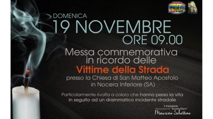 Sulla base di tale opera di prevenzione, l’Associazione “Social – Disco” aderisce alla Giornata, organizzando, nuovamente, una messa commemorativa in ricordo di tutti coloro che hanno perso la vita in seguito ad un drammatico incidente stradale. L’appuntamento è per domenica 19 novembre, alle ore 9,00, presso la Chiesa di San Matteo Apostolo in Nocera Inferiore, affinché si possa, come recita il consolidato messaggio dell’Associazione romana, “Ricordare per Cambiare”. L’invito è esteso ai parenti, amici e conoscenti delle vittime, oltre alla cittadinanza dell’intero comprensorio.