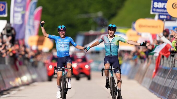Una 16ª tappa memorabile al Giro d’Italia 2025, segnata dal ritorno al successo per il ciclismo italiano dopo un lungo digiuno. A firmare l’impresa è Christian Scaroni che, insieme al compagno di squadra Lorenzo Fortunato, ha dominato la frazione da Laas a Brentonico San Valentino con una fuga di oltre 180 chilometri sotto la pioggia. I due corridori dell’Astana sono arrivati mano nella mano sul traguardo, con Fortunato che ha lasciato la vittoria al compagno dopo aver consolidato il proprio primato nella classifica degli scalatori. Terzo posto per Giulio Pellizzari che completa una splendida tripletta azzurra. La tappa ha visto anche il primo cedimento della maglia rosa Isaac Del Toro che, pur restando leader della classifica generale, ora ha appena 26 secondi di vantaggio su Simon Yates e 31 su Richard Carapaz. Il messicano ha perso contatto sull’ultima salita ma è riuscito a contenere i danni. Intanto Derek Gee continua a sorprendere, mentre Damiano Caruso e Egan Bernal mantengono la posizione. Giornata amara invece per Antonio Tiberi e soprattutto per Juan Ayuso, che ha ceduto già sul penultimo GPM e ha chiuso con quasi 15 minuti di ritardo, uscendo di fatto dalla lotta per la generale. Dramma anche per Primoz Roglic che è stato costretto al ritiro dopo una nuova caduta, la terza in questo Giro: lo sloveno è finito a terra ai piedi del GPM di Candriai assieme a Carapaz, che però è riuscito a ripartire e a recuperare nel finale. Roglic abbandona così la corsa rosa dove era partito tra i grandi favoriti, a due anni dalla sua vittoria nel 2023. L’impresa di Scaroni è stata costruita con intelligenza e coraggio. “Io e Fortunato ci siamo parlati negli ultimi chilometri, lui ha preso i punti per la maglia azzurra e io la tappa. È una vittoria per la squadra” ha dichiarato il vincitore al traguardo. Ora il Giro entra nella fase decisiva e la lotta per la maglia rosa si fa sempre più serrata