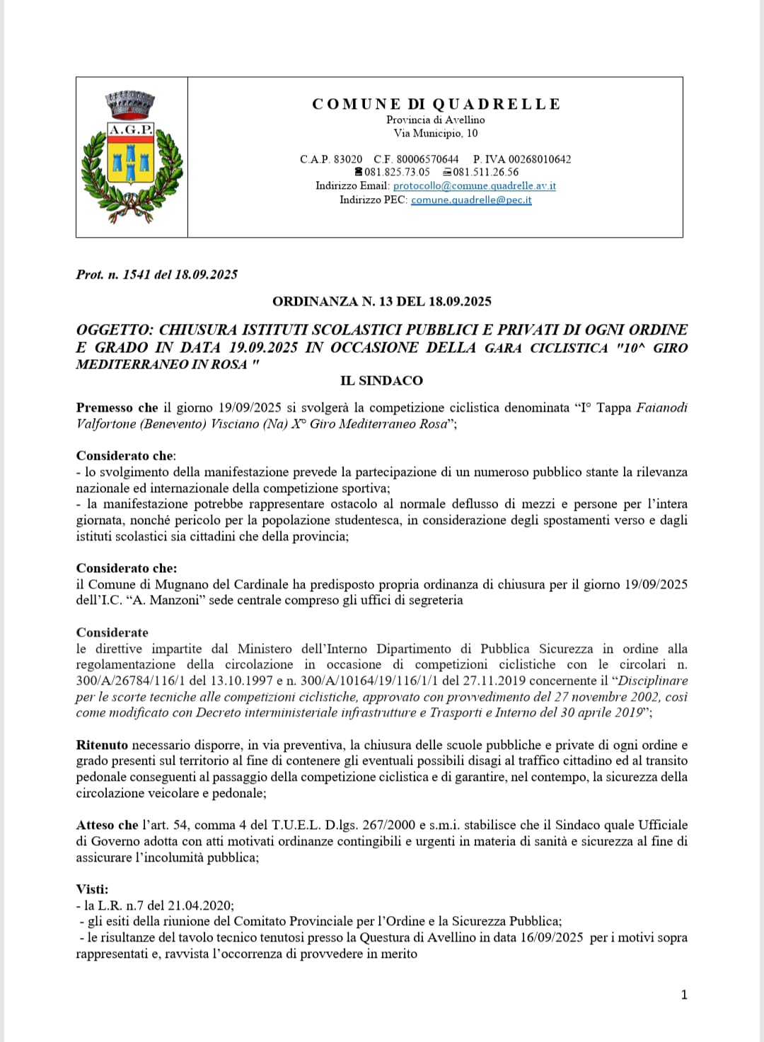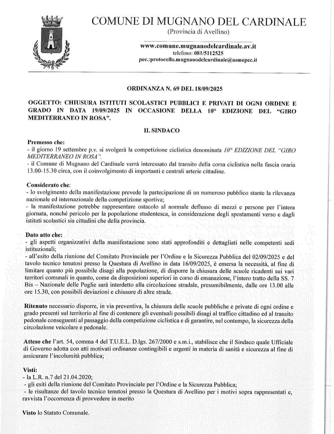 In occasione della prima tappa del 10° Giro Mediterraneo in Rosa, in programma venerdì 19 settembre 2025, che vedrà la carovana ciclistica attraversare diversi centri dell’Irpinia e del Nolano, i Comuni di Mugnano del Cardinale, Quadrelle e Sirignano hanno disposto la chiusura di tutte le scuole di ogni ordine e grado.