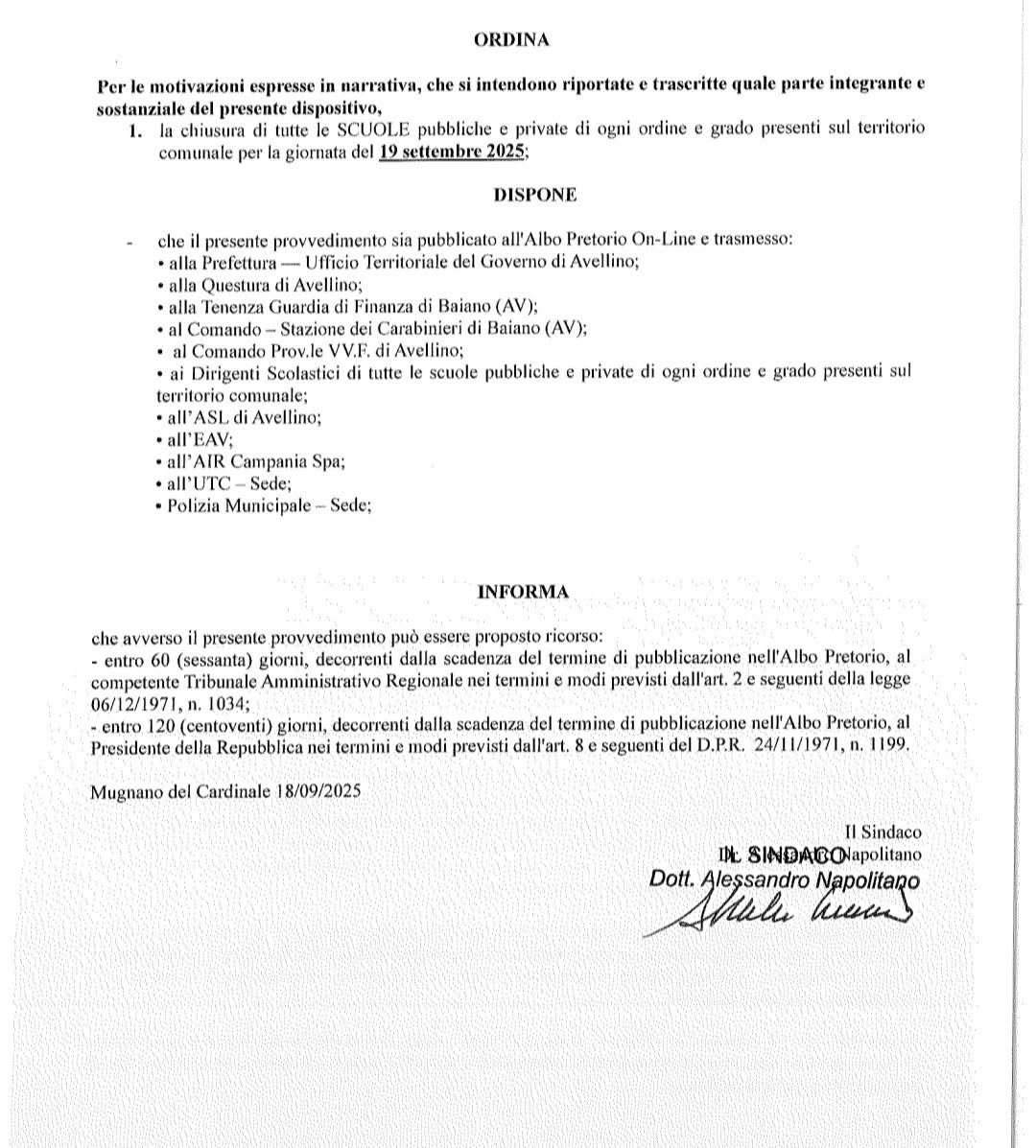 L’ordinanza è partita da Mugnano del Cardinale, dove il sindaco Alessandro Napolitano ha stabilito non solo lo stop alle lezioni, ma anche la chiusura degli uffici di segreteria dell’I.C. “A. Manzoni”. Una misura che ha reso di fatto inevitabile l’adozione di provvedimenti analoghi anche nei Comuni di Quadrelle e Sirignano, i cui sindaci Simone Rozza e Antonio Colucci hanno firmato ordinanze di chiusura delle scuole.