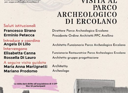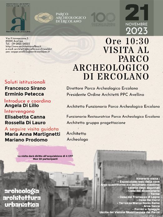 L’Ordine degli architetti della provincia di Avellino ha organizzato per il 21 novembre 2023, per gli iscritti, una visita al parco archeologico di Ercolano per approfondire le tecniche e le modalità che hanno caratterizzato i recenti restauri. I partecipanti saranno accolti dal direttore del parco archeologico Francesco Sirano e dal presidente degli architetti irpini Erminio Petecca. Interverranno alla giornata di studio Angela Di Lillo, funzionario del parco archeologico e coordinatrice dell’incontro, Elisabetta Canna, restauratrice del parco archeologico, Rossella Di Lauro, architetto del gruppo di progettazione. La visita sarà guidata dall’architetto Maria Anna Martignetti e dall’archeologo Mariano Prodomo mostrando: l’Esposizione resti della nave, l’Arco quadriforme sul decumano massimo, il Sacello degli augustali, la Casa del bicentenario, le Terme, la Casa dal tramezzo di legno, la Casa dei cervi, la Terrazza Marco Nonio Balbo, l’Area sacra, le Fornici e spiaggia e l’Uscita dal vialone monumentale del Parco.