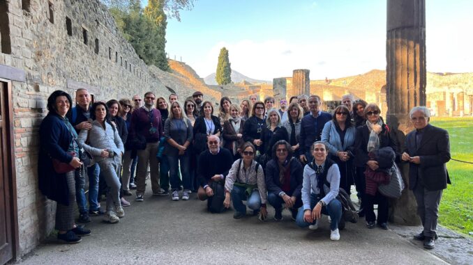Pompei. L’Ordine degli architetti della provincia di Avellino ha organizzato oggi (11.11.2022), una visita presso i cantieri di Pompei antica per approfondire le tecniche e le modalità che hanno caratterizzato i recenti restauri. La visita è stata guidata dall’archeologo Mariano Prodomo e dall’architetto Maria Anna Martignetti mostrando: le terme suburbane, il foro e gli edifici, la casa del Fauno, la casa degli amorini dorati, Leda e il cigno, l’acquedotto, la panetteria, la casina dell’Aquila, la casa di Cecere, la casa dell’Efebo, la casa degli amanti, il quartiere dei teatri, ma soprattutto è stata visitata la casa dei Dioscuri, tra le più sontuose e vaste dell’ultimo periodo di Pompei, scoperta tra il 1828 e il 1829, aperta al pubblico in questi giorni. “L’incontro di Pompei antica, presso il suggestivo sito archeologico, patrimonio mondiale UNESCO, rappresenta un notevole momento formativo per i nostri iscritti appassionati ed inseriti nel mondo del restauro. E’ stata una bellissima giornata di immersione nella nostra storia, con la possibilità di riprendere i contatti personali dopo il lungo periodo della pandemia, spinti soprattutto dalla voglia di riapprocciarci con il sapere, le conoscenze, i rapporti emozionali che ci trasmette la cultura del nostro passato”, lo dichiara il presidente Erminio Petecca.