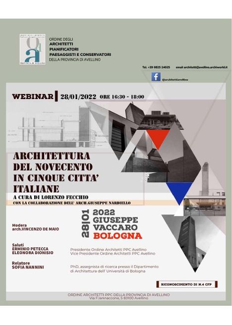 E’ iniziato oggi, attraverso la piattaforma gotowebinar, il ciclo di cinque incontri dal titolo “L’architettura del Novecento in cinque città italiane”. Bologna è la prima città ad essere stata trattata dal punto di vista storico e compositivo, attraverso documenti e disegni di archivio dell’architetto Giuseppe Vaccaro. I prossimi incontri riguarderanno: l’11 febbraio Roma con le opere di Marcello Piacentini, a seguire Napoli il 25 febbraio con le opere dell’architetto Stefania Filo Speziale, l’11 marzo Torino con i progetti di Carlo Mollino e a chiusura il 25 marzo Avellino con un incontro dedicato alle opere dell’architetto Francesco Fariello che hanno lasciato un segno nel paesaggio urbano della città. Gli eventi sono curati da Lorenzo Fecchio docente di storia dell’architettura contemporanea all’Università di Genova, con la collaborazione del consigliere dell’ordine irpino Giuseppe Nardiello. Sono intervenuti Erminio Petecca, presidente dell’ordine irpino, Eleonora Dionisio, vice presidente dell’ordine, ha relazionato Sofia Nannini, assegnista di ricerca presso il dipartimento di Architettura dell’università di Bologna sul protagonista della giornata di studio, l’architetto Giuseppe Vaccaro, un grande dell’architettura del ‘900, illustrando nello specifico, con molti elementi di dettaglio lo studio per la realizzazione di due importanti opere: la facoltà di Ingegneria e la chiesa di San Giovanni Bosco.