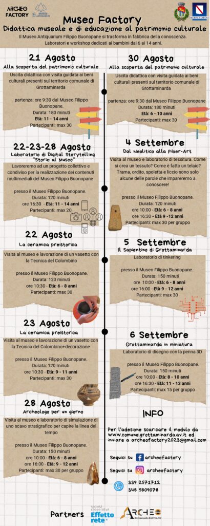 Si comincia lunedì 21 agosto con “Alla scoperta del patrimonio culturale”: uscita didattica con visita guidata ai beni culturali presenti sul territorio comunale di Grottaminarda con partenza alle ore 9:30 dal Museo civico “Filippo Buonopane”. Durata 180 minuti, età: 11-14 anni, massimo 30 partecipanti.